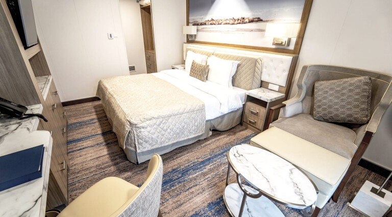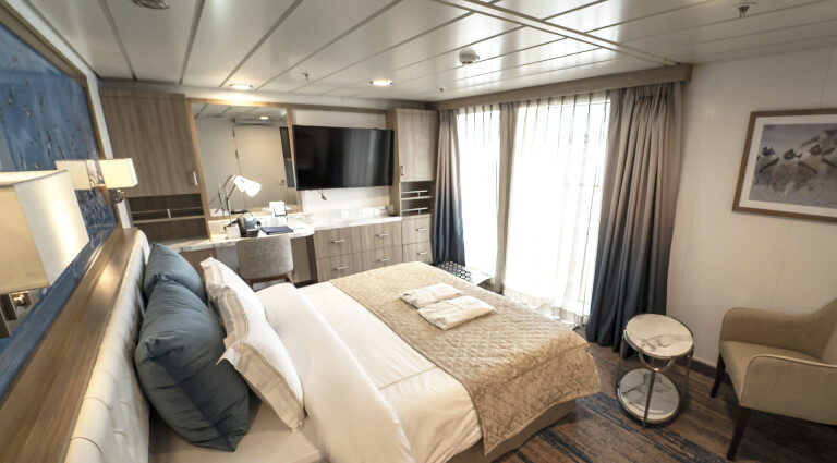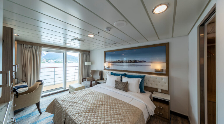 Mit etwas mehr Platz zum Ausstrecken sind die Superior-Balkonkabinen ideal für Polarreisende, die mit viel Ausrüstung unterwegs sind. Die Kabinen befinden sich auf Deck 4 und 6 und verfügen über bodentiefe Fenster, eigene Badezimmer sowie einen komfortablen Schreibtischbereich.