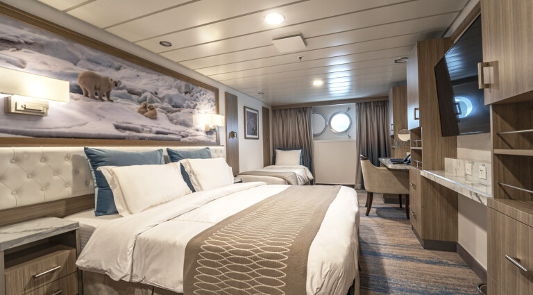Es gibt sechs Aurora Dreibett-Kabinen mit Bullaugen, alle mit eigenem Bad. Sie befinden sich auf Deck 3, in der Nähe des Mudrooms und der Ein- und Ausschiffungsplattformen. Bitte beachten Sie, dass die Aurora Dreibett-Kabinen nur auf bestimmten Abfahrten verfügbar sind.