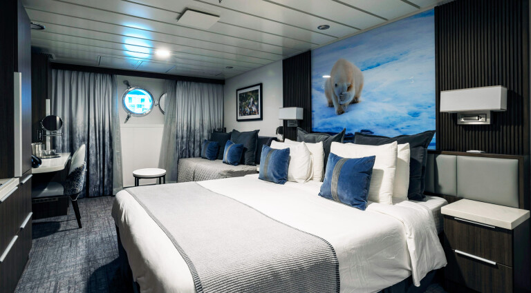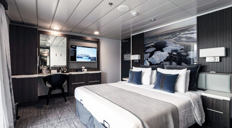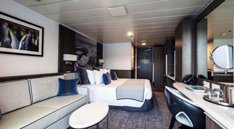 Mit etwas mehr Platz zum Ausstrecken sind die Superior-Balkonkabinen ideal für Polarreisende, die mit viel Ausrüstung unterwegs sind. Die Kabinen befinden sich auf Deck 4 und 6 und verfügen über bodentiefe Fenster, eigene Badezimmer sowie einen komfortablen Schreibtischbereich.