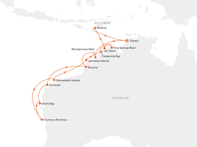 Darwin ----- Montgomery Reef ----- Broome ----- Exmouth ----- Shark Bay ----- Houtman Abrolhos ----- Montebello Islands ----- Lacepede Islands ----- Careening Bay ----- King George River ----- Jar Island ----- Kupang ----- Darwin