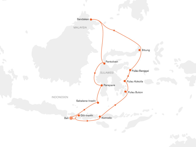 Benoa (Bali) ----- Gili-Inseln ----- Komodo ----- Pulau Buton ----- Pulau Kokoila ----- Pulau Banggai ----- Bitung ----- Sandakan ----- Pantoloan ----- Parepare ----- Sabalana-Inseln ----- Benoa (Bali)