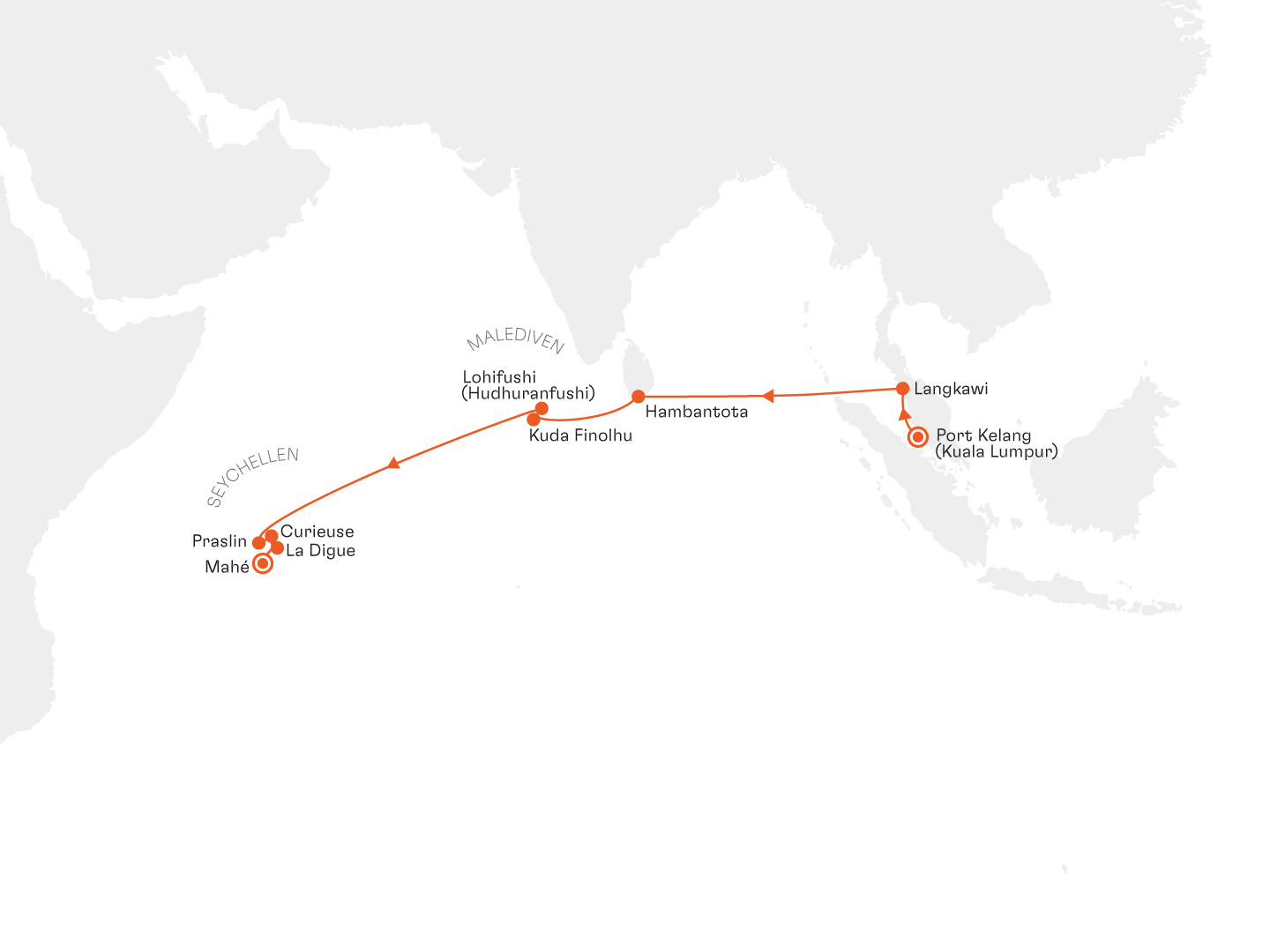 Port Kelang (Kuala Lumpur) ----- Porto Malai (Langkawi) ----- Hambantota ----- Lohifushi (Nord-Male-Atoll) ----- Kuda Finolhu (Süd-Male-Atoll) ----- Praslin ----- Curieuse ----- La Digue ----- Victoria (Mahé)