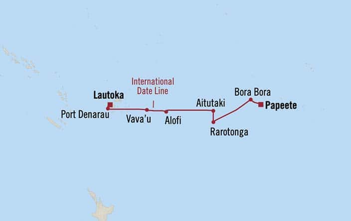 Papeete ----- Bora Bora ----- Rarotonga ----- Aitutaki ----- Alofi ----- Vava’u (Neiafu) ----- Port Denarau ----- Lautoka