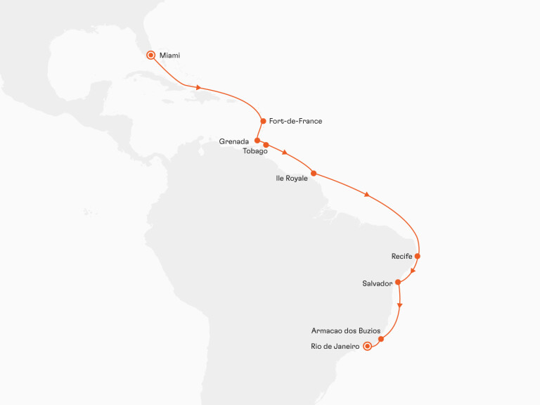 Miami ----- Fort-de-France ----- St. George’s ----- Scarborough ----- Ile Royale ----- Recife ----- Salvador ----- Armacao dos Buzios ----- Rio de Janeiro