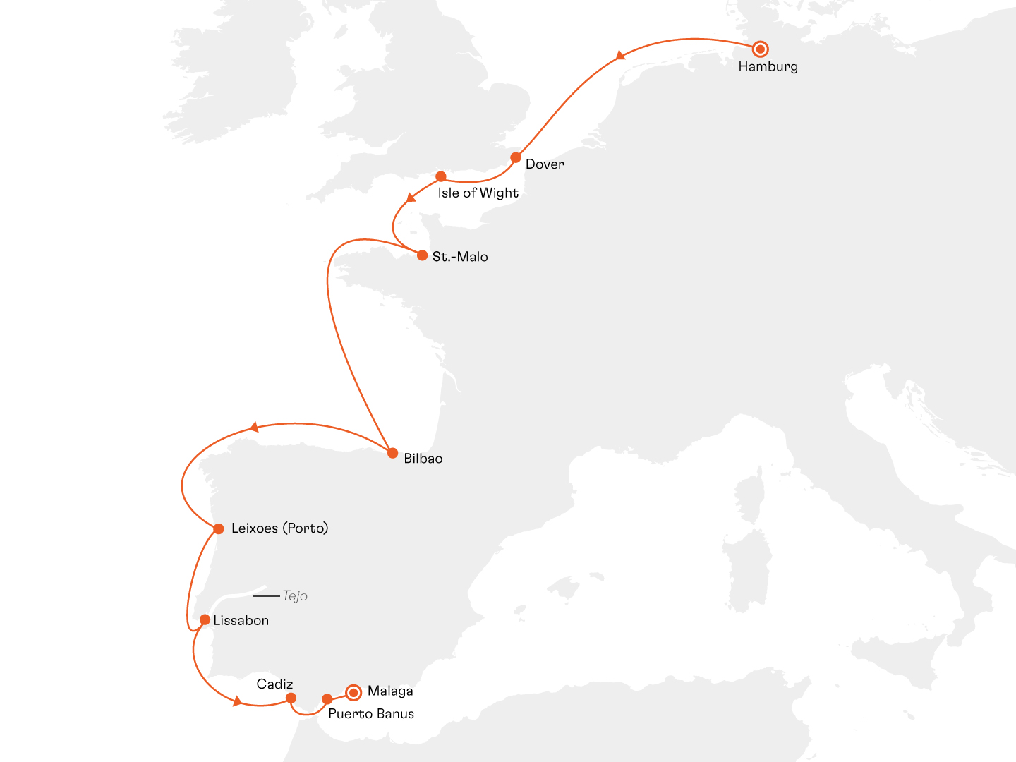 Hamburg ----- Dover ----- Cowes ----- St.-Malo ----- Bilbao ----- Leixoes (Porto) ----- Lissabon ----- Cadiz ----- Marbella (Puerto Banus) ----- Malaga