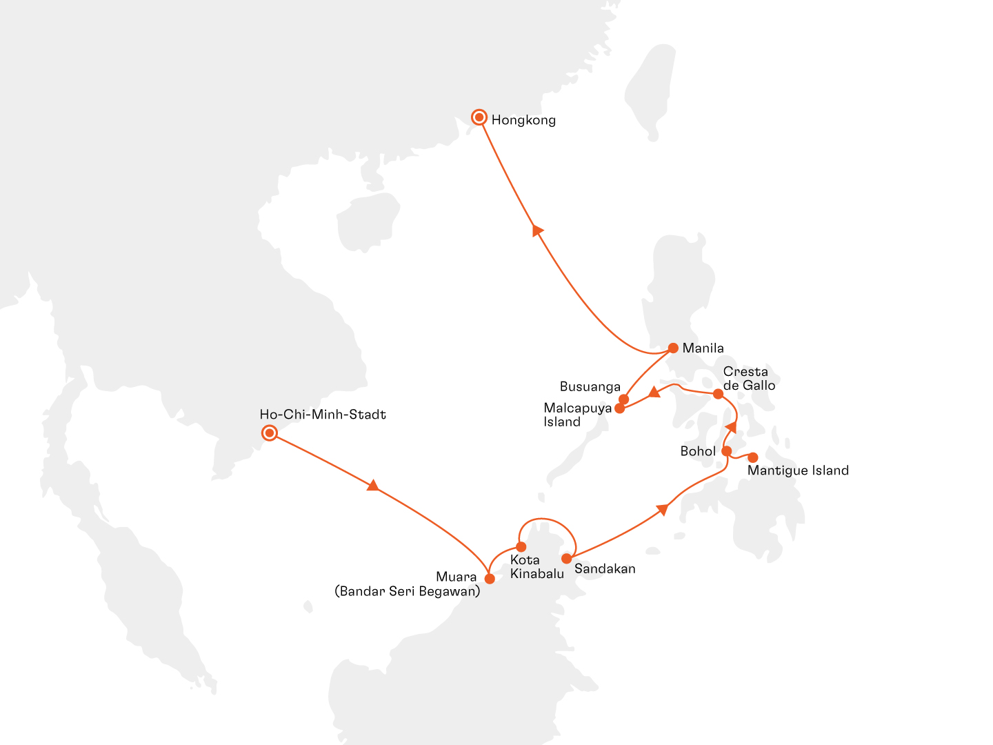 Ho-Chi-Minh-Stadt ----- Muara (Bandar Seri Begawan) ----- Kota Kinabalu ----- Sandakan ----- Tagbilaran (Bohol) ----- Mantigue Island ----- Cresta de Gallo ----- Malcapuya Island ----- Coron ----- Manila ----- Hongkong