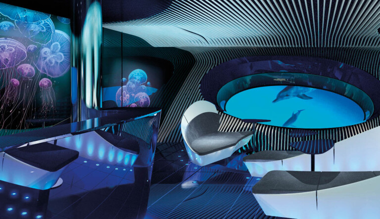 Inspiriert von den seinen Naturbeobachtungen kreierte Jacques Rougerie das Grundkonzept der Under Water Lounge. Der Linienverlauf erinnert an Wale und Quallen und lenkt zu den zwei Bullaugen, in Form von Walaugen, die weit geöffnet in die atemberaubende Unterwasserwelt blicken.